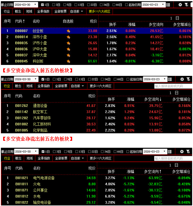 从板块资金动向数据来看,截止到今日午间收盘时,在资金流入榜上,通信设备板块以39.75亿的资金流入额位居榜首;其次是航空军工板块,资金流入24.67亿;此外,汽车零部件板块、化工新材料板块、化学制品板块也都相继上榜,三个板块的资金流入额分别为15.96亿、13.91亿、13.00亿;再看资金流出榜,电源电气设备板块引领做空,资金流出63.99亿;其次是火电板块,资金流出32.83亿;此外,公共事业板块、水电板块、输变电设备板块的资金流出额也都相对较多,分列资金流出榜第三到第五名位置。综合比较后可知,今日上午不仅通信设备板块资金流入接近40亿,航空军工、汽车零部件、化工新材料、化学制品等板块的资金流入额也都在13亿之上,说明早间大盘的低开并没有对场内多方人气产生太大影响;反观空方阵营,虽然电源电气设备板块资金流出超过60亿,同时火电板块与公共事业板块的资金流出额也都在30亿之上,但其余板块并未跟随大幅做空,故此整体抛压尚在可控范围之内。可见今日上午既有资金积极流入的板块,也有资金大幅流出的板块,多空双方你来我往,争夺较为激烈。在这种情况下,行情就难以形成一个明确的方向,预计市场在短期内仍会在3900点附近反复震荡。建议大家控制好仓位,同时可关注近期有资金连续加仓的板块,并在其中优选个股,择机介入。
